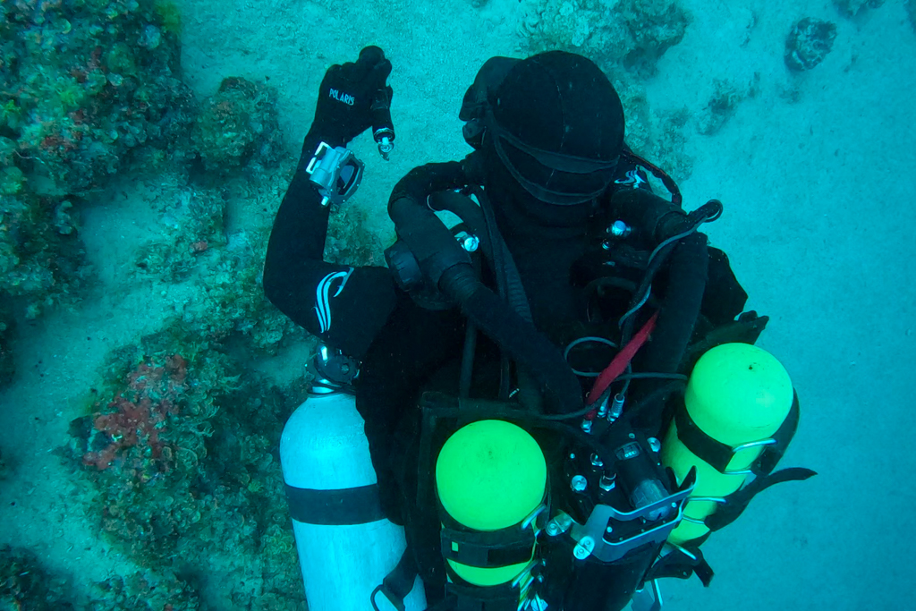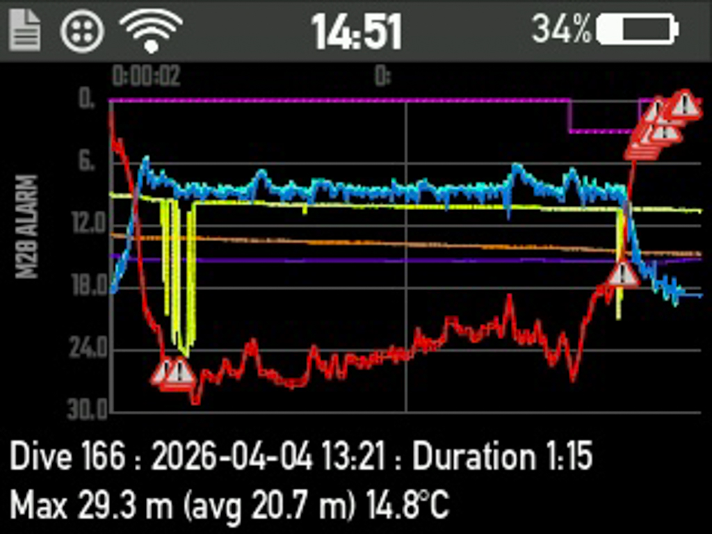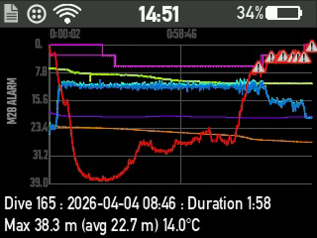 Celoten potop je bil skoraj dve uri. In ja brez “težav” ni šlo. Kljub servisu rebriderja, pride do korozije konektorjev na glavi rebriderja. S to nadlogo se ukvarjam že preko enega leta. Sicer lani sem to odpravil in nisem imel težav. Letos se je očitno korozija vrnila. Rešitev je sicer čisto enostavna, a na terenu nisem imel s seboj utreznega čistila! Na koncu potopa se vidi klicaje, ker napaka javlja rebriderju manjo DIL senzorja. K sreči imam dosti znanja in kot inštruktor moje tečajnike na tečaju CCR 40 naučim te detajle, da vedo kako pravilno odreagirat!