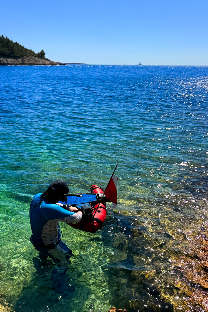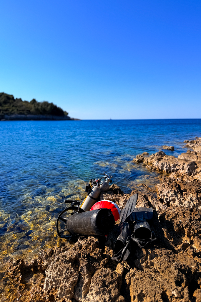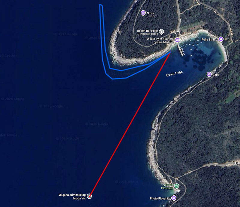 Iz zgodnje slike je razvidno, da sem se “pošvercal” na Titov wreck Vis na Kamenjaku. Ker je izven sezone itak noben DC ne vozi tja, pa še vstopnine v park ni 😉 Po jutranji kavi se zapeljem do Kamenjaka. Znosim tiste flaškone do vode, tokrat brez NX50, obesim kompas na DPV in že skutram. 17 minut imam zabeleženo, da traja vožnja. Jebemtiš – 38m wrecka nikjer. Falil!