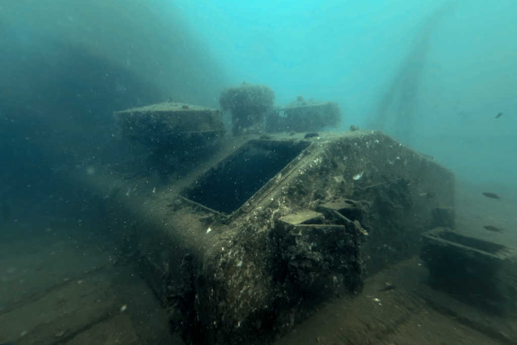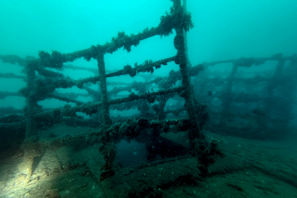 Malenkost na sever in po isti koti dirkam nazaj z zmanjašno hitrostjo. Sam DPV ima sicer največjo hitrost 50m/min, in baterija pri tej hitrosti zdrži 2 uri. Nič čudnega da čudo tehta 30kg. Po nekaj minutah vidim na tleh en alu stage z regulatorjem. Si rečem, no nekje blizu mora biti wreck. Glej ga zlomka, se zaletim vanj. Pred mano črna senca in pridem na wreck točno pri desnem boku, kjer je luknja od detonacije.