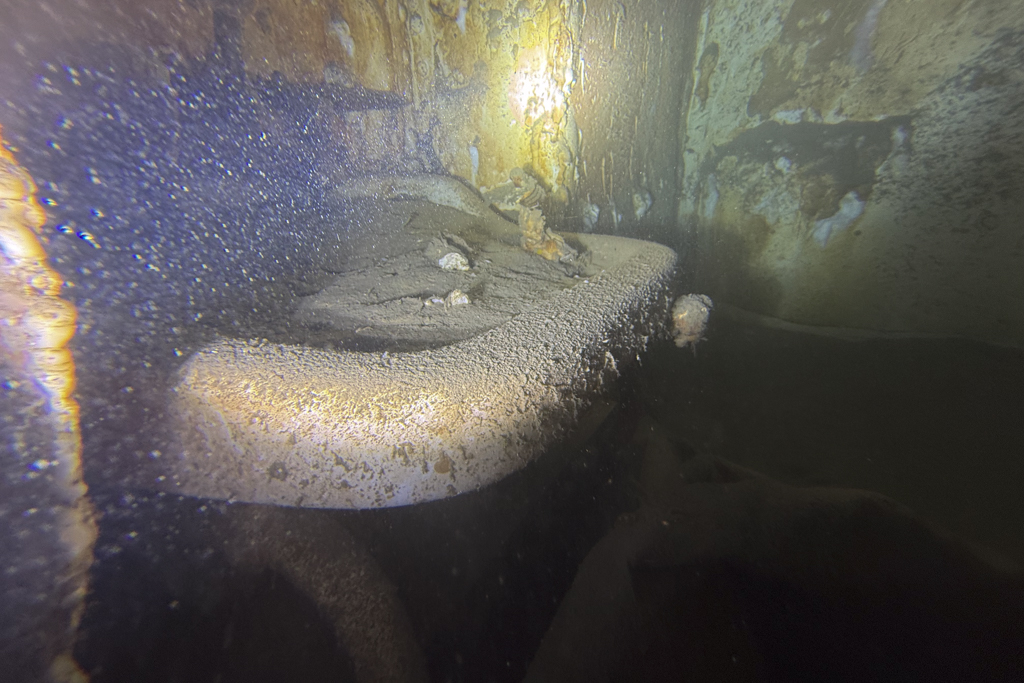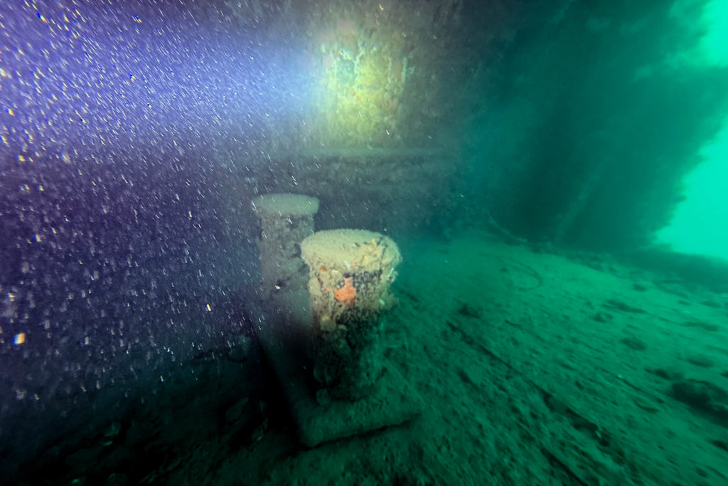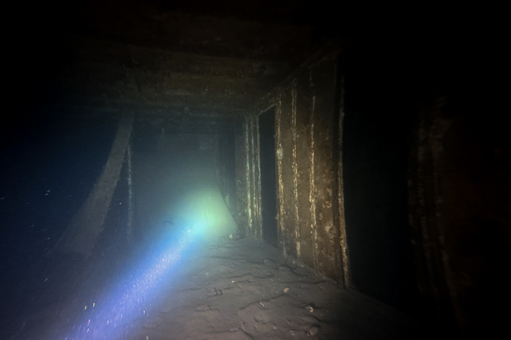 DPV zavežem na wreck, kot tudi desni bočnik, da me ne ovira pri raziskovanju in penetraciji. V notranjosti wrecka je že ogromno mivke, kar pomeni izredno pazljivost. Poleg tega pa je padlo precej električne inštalacije s stropa. Wreck je simpl nevaren za raziskovanje v notranjost.