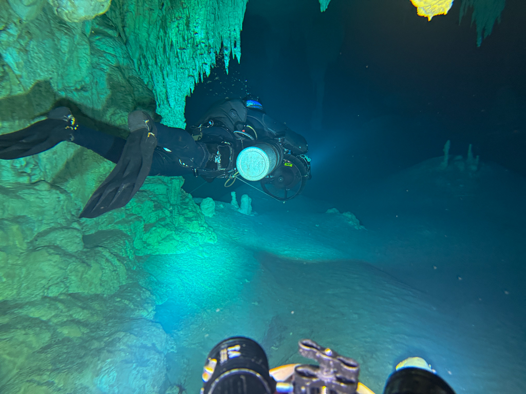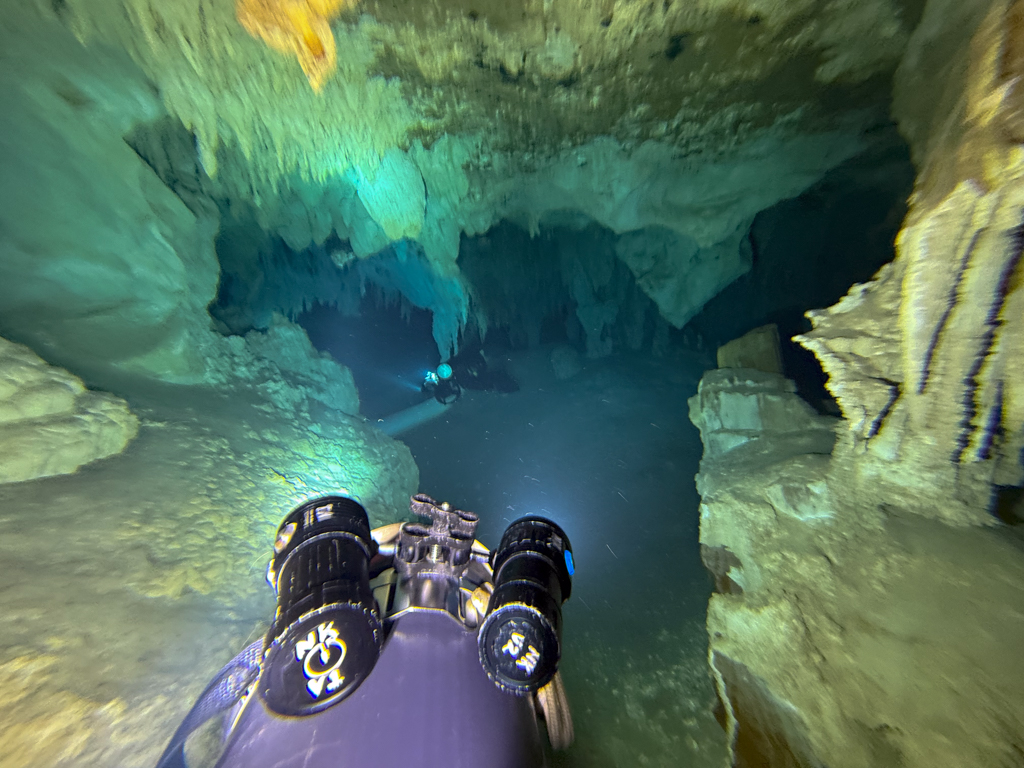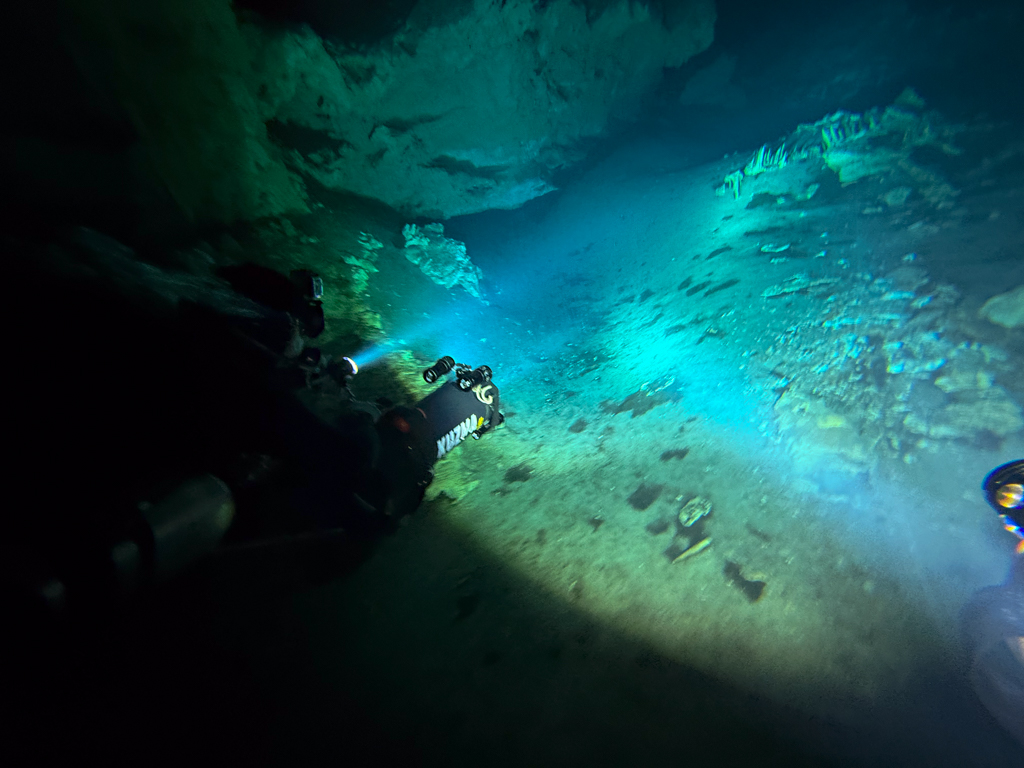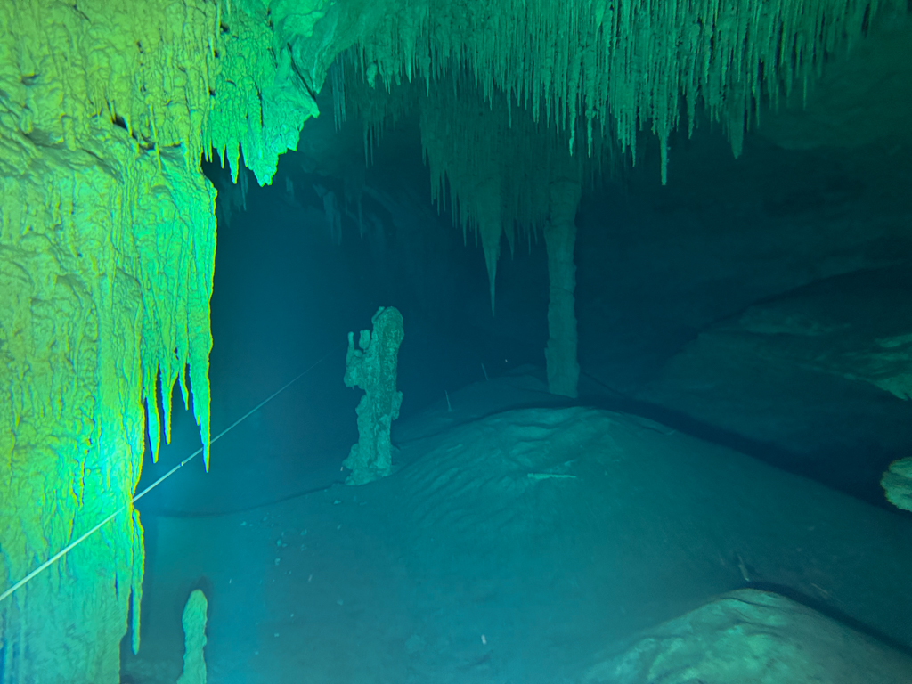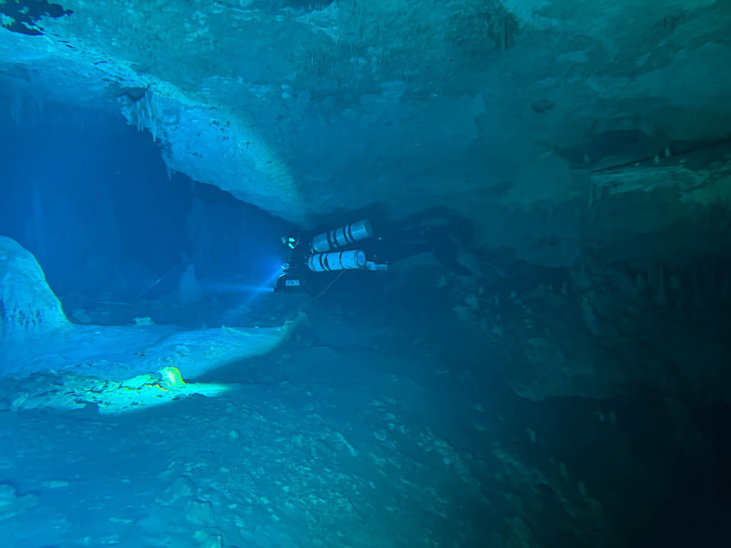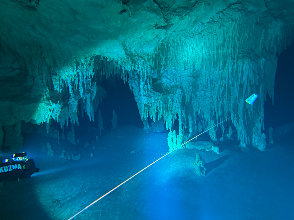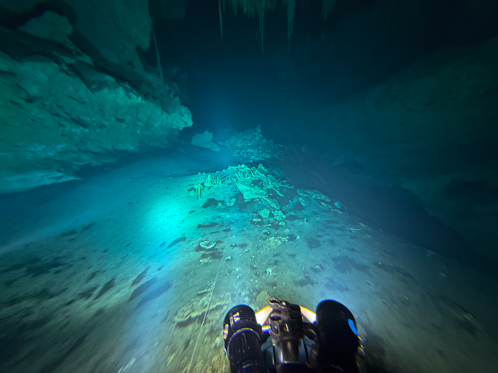 Skutrala sva preko 80 minut v eno smer, pri 2/3 jame, ki je seveda široka, kot reka Sava v Kranju so se na glavni vrvici začele pojavljati oznake. No pri 8000 čevljih, beri cca slabe 3km v jamo, pri globini 6.7m sva seveda obrnila. Nazaj grede sem mu predlagal, da zmanjšava hitrost skutrov na 1/3 hitrosti, saj se ven pomikaš s tokom reke, ki jo je tu čutiti neverjetno. Res, da je temperatura vode 26°C a Repnika, je kot po navadi “ornk” treslo. Obrat je bil odrešitev, a kaj ko je pred nama še slaba ura skutranja….