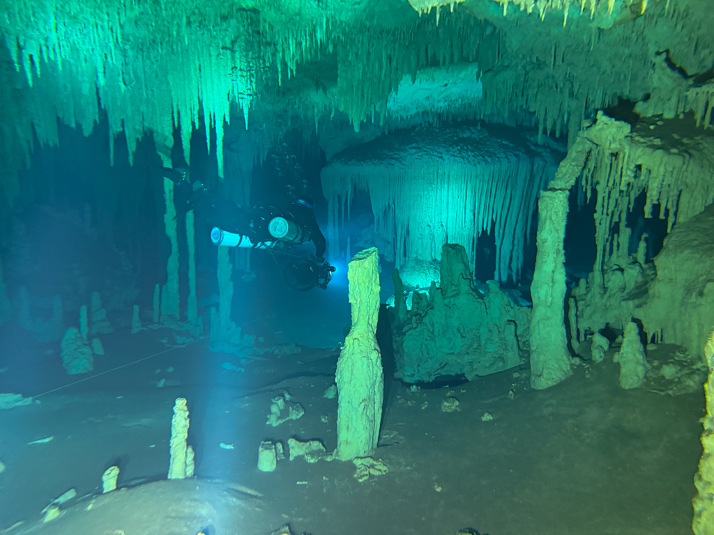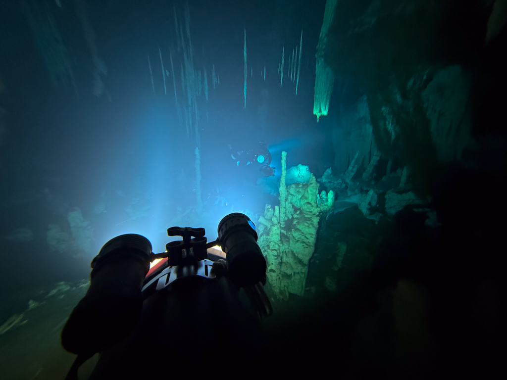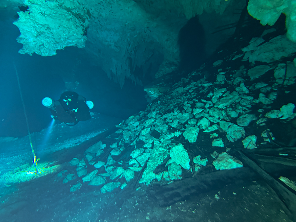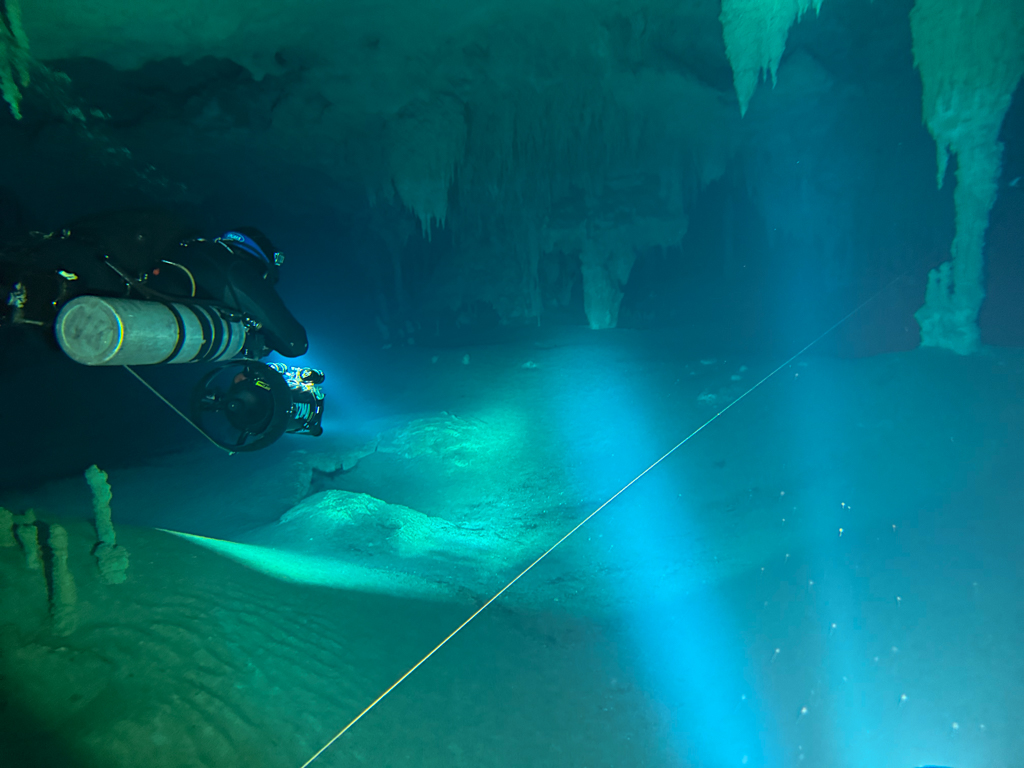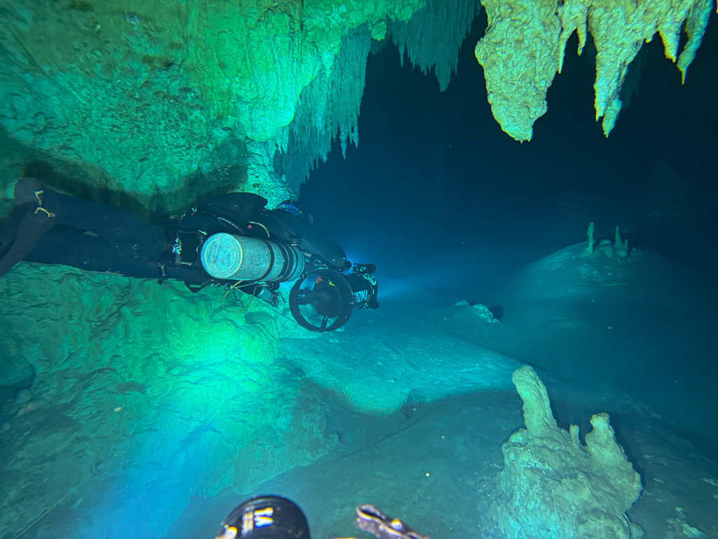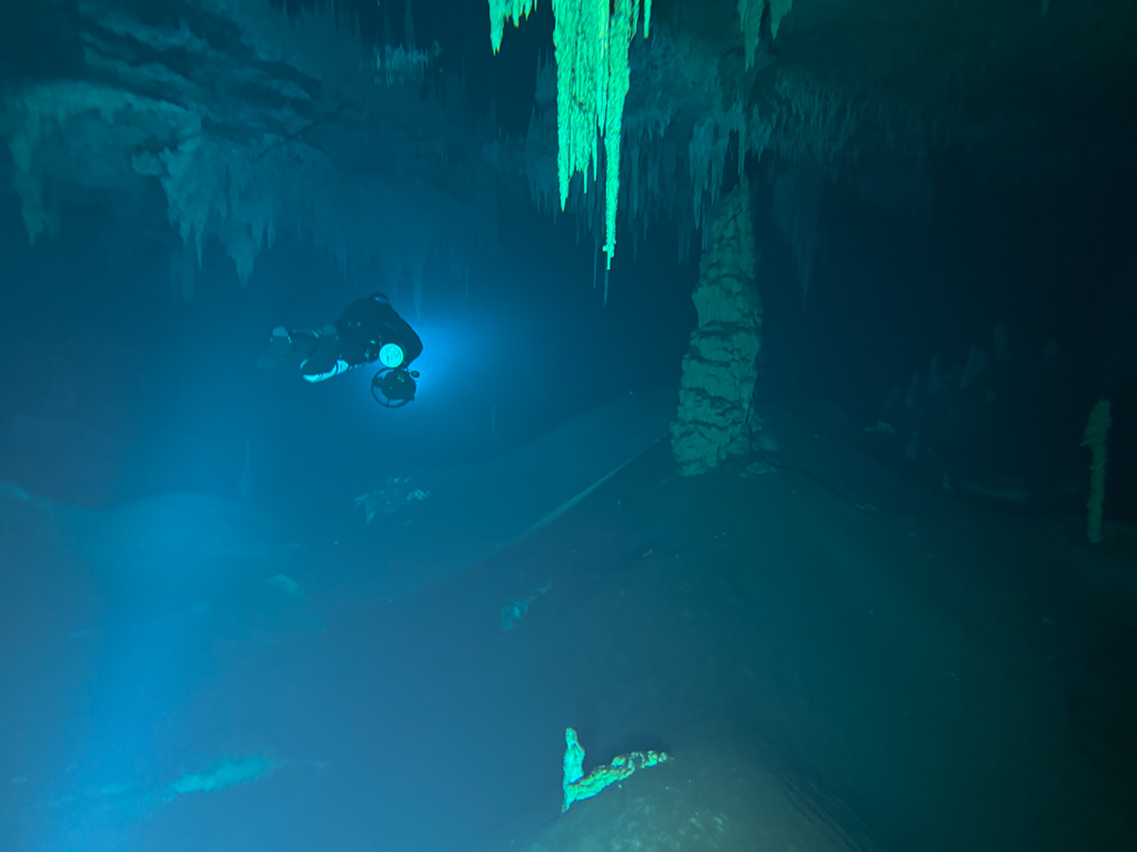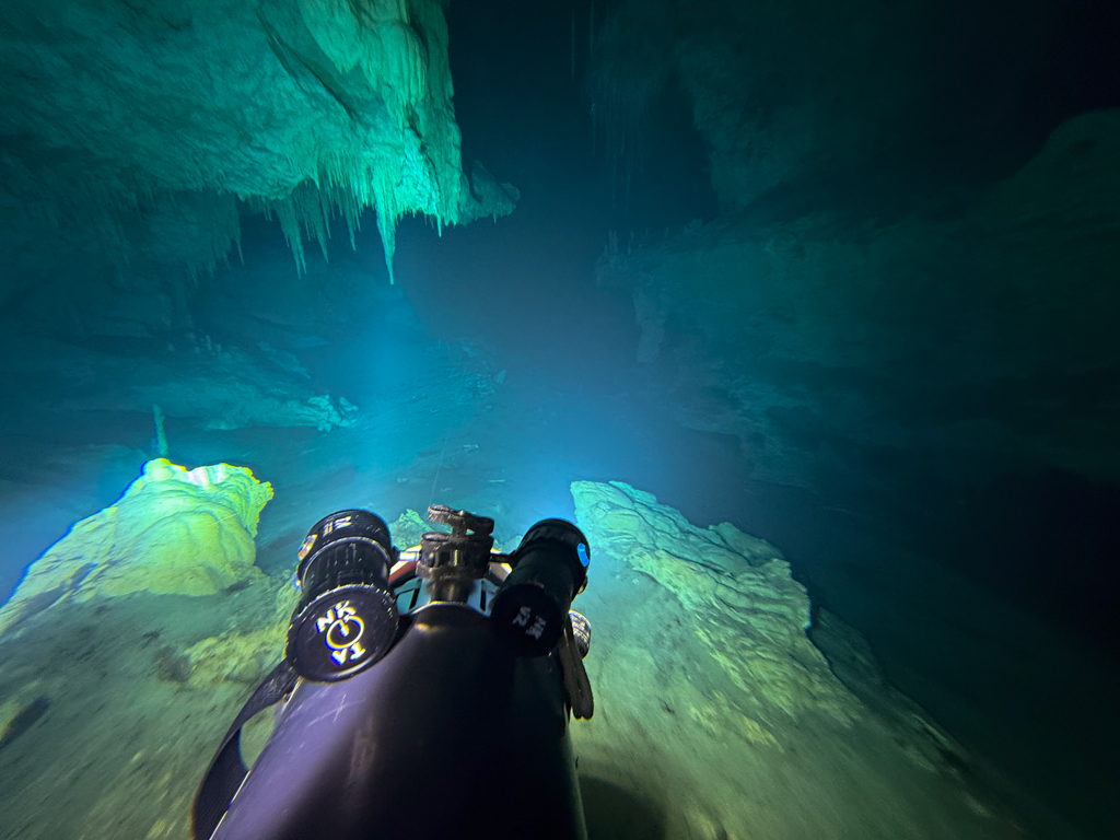 Skutrala sva preko 80 minut v eno smer, pri 2/3 jame, ki je seveda široka, kot reka Sava v Kranju so se na glavni vrvici začele pojavljati oznake. No pri 8000 čevljih, beri cca slabe 3km v jamo, pri globini 6.7m sva seveda obrnila. Nazaj grede sem mu predlagal, da zmanjšava hitrost skutrov na 1/3 hitrosti, saj se ven pomikaš s tokom reke, ki jo je tu čutiti neverjetno. Res, da je temperatura vode 26°C a Repnika, je kot po navadi “ornk” treslo. Obrat je bil odrešitev, a kaj ko je pred nama še slaba ura skutranja….