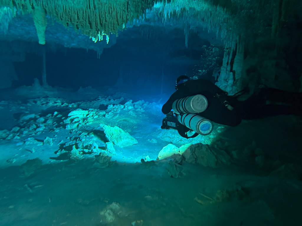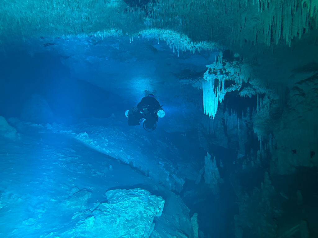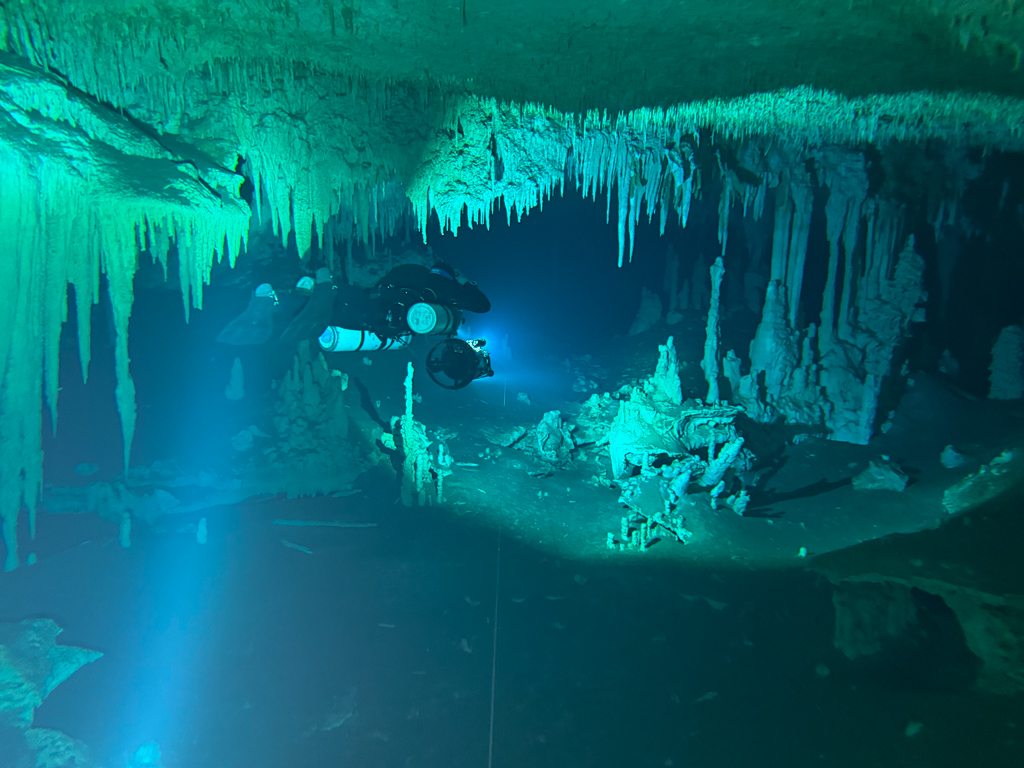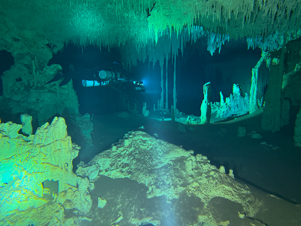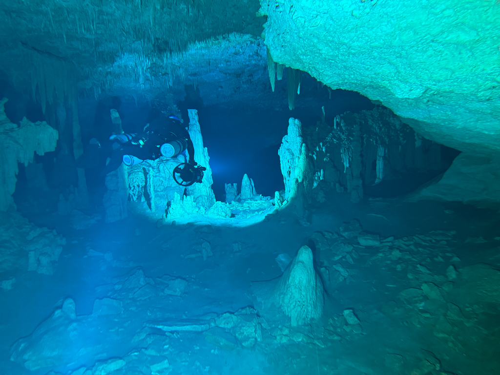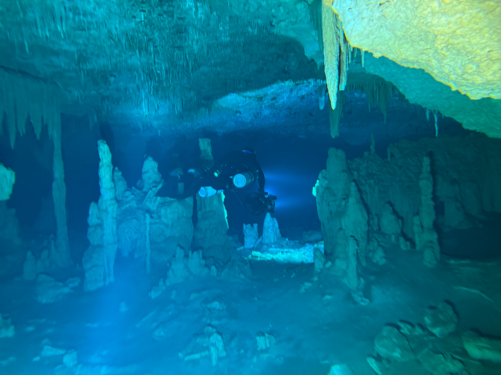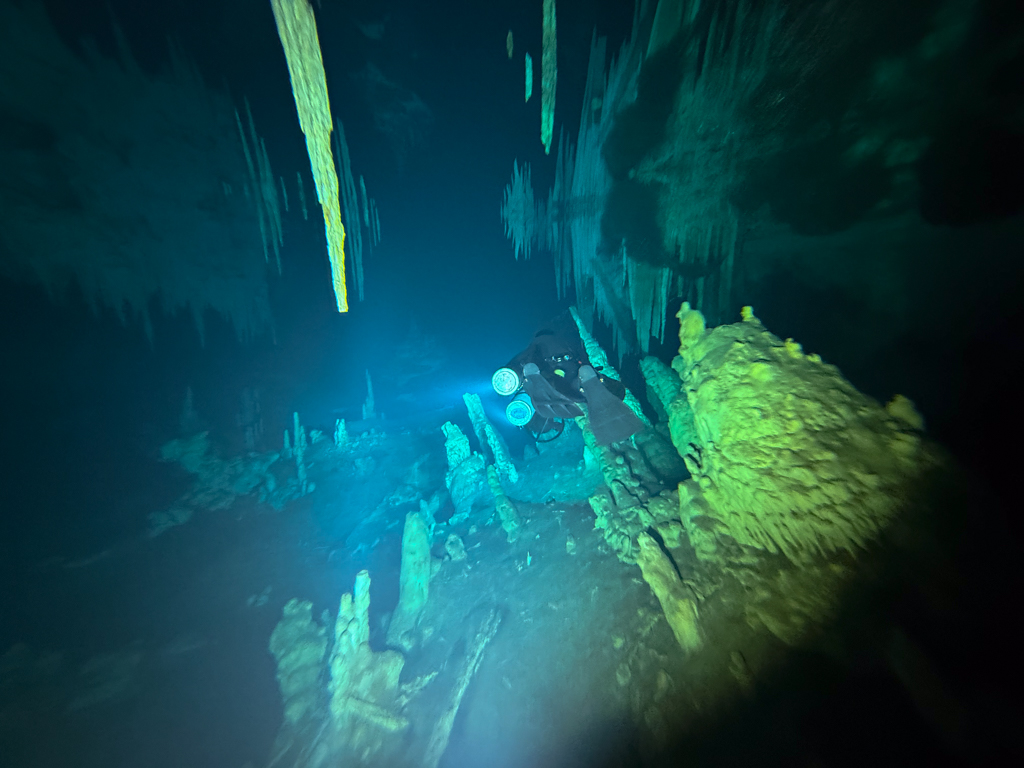 Skutrala sva preko 80 minut v eno smer, pri 2/3 jame, ki je seveda široka, kot reka Sava v Kranju so se na glavni vrvici začele pojavljati oznake. No pri 8000 čevljih, beri cca slabe 3km v jamo, pri globini 6.7m sva seveda obrnila. Nazaj grede sem mu predlagal, da zmanjšava hitrost skutrov na 1/3 hitrosti, saj se ven pomikaš s tokom reke, ki jo je tu čutiti neverjetno. Res, da je temperatura vode 26°C a Repnika, je kot po navadi “ornk” treslo. Obrat je bil odrešitev, a kaj ko je pred nama še slaba ura skutranja….