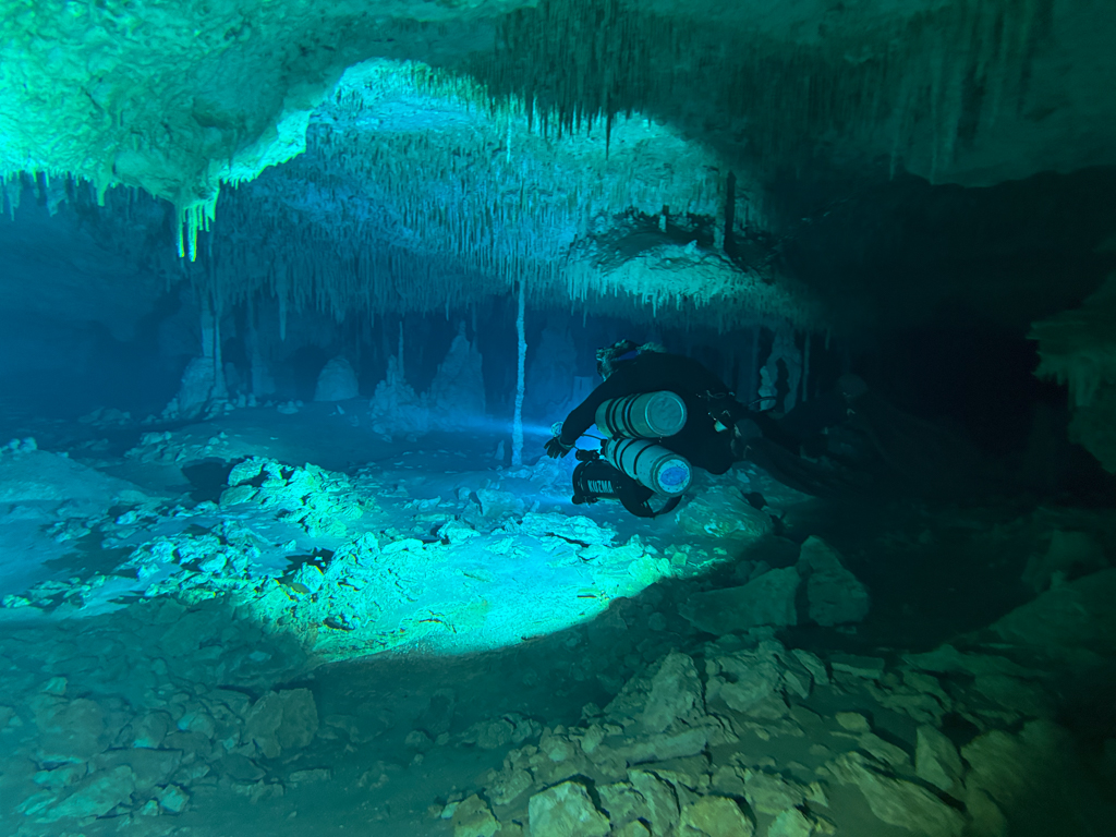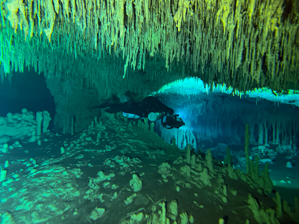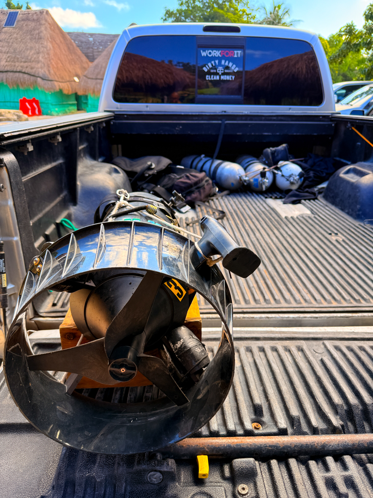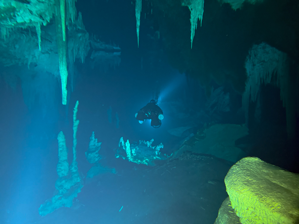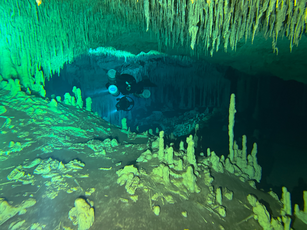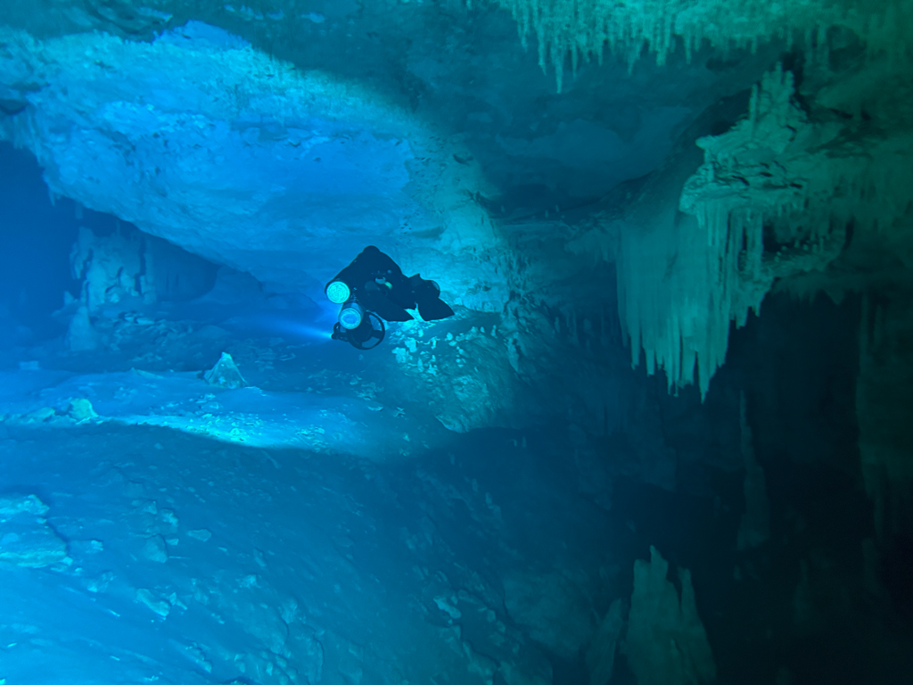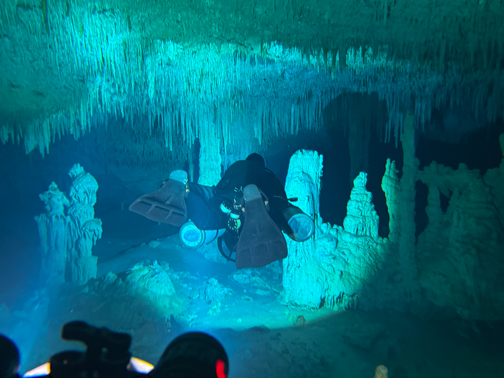 Skutrala sva preko 80 minut v eno smer, pri 2/3 jame, ki je seveda široka, kot reka Sava v Kranju so se na glavni vrvici začele pojavljati oznake. No pri 8000 čevljih, beri cca slabe 3km v jamo, pri globini 6.7m sva seveda obrnila. Nazaj grede sem mu predlagal, da zmanjšava hitrost skutrov na 1/3 hitrosti, saj se ven pomikaš s tokom reke, ki jo je tu čutiti neverjetno. Res, da je temperatura vode 26°C a Repnika, je kot po navadi “ornk” treslo. Obrat je bil odrešitev, a kaj ko je pred nama še slaba ura skutranja….